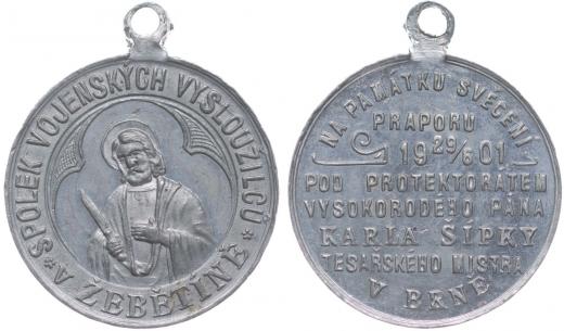 Žebětín - na památku svěcení praporu spolku vojenských vysloužilců pod protektorátem vysokorodého pána Karla Šípky tesařského mistra v Brně 29.6.1901, svatý Šebestián v kartuši, opis / 6řádk.nápis, opis Sn 29 mm_orig.raž.ouško