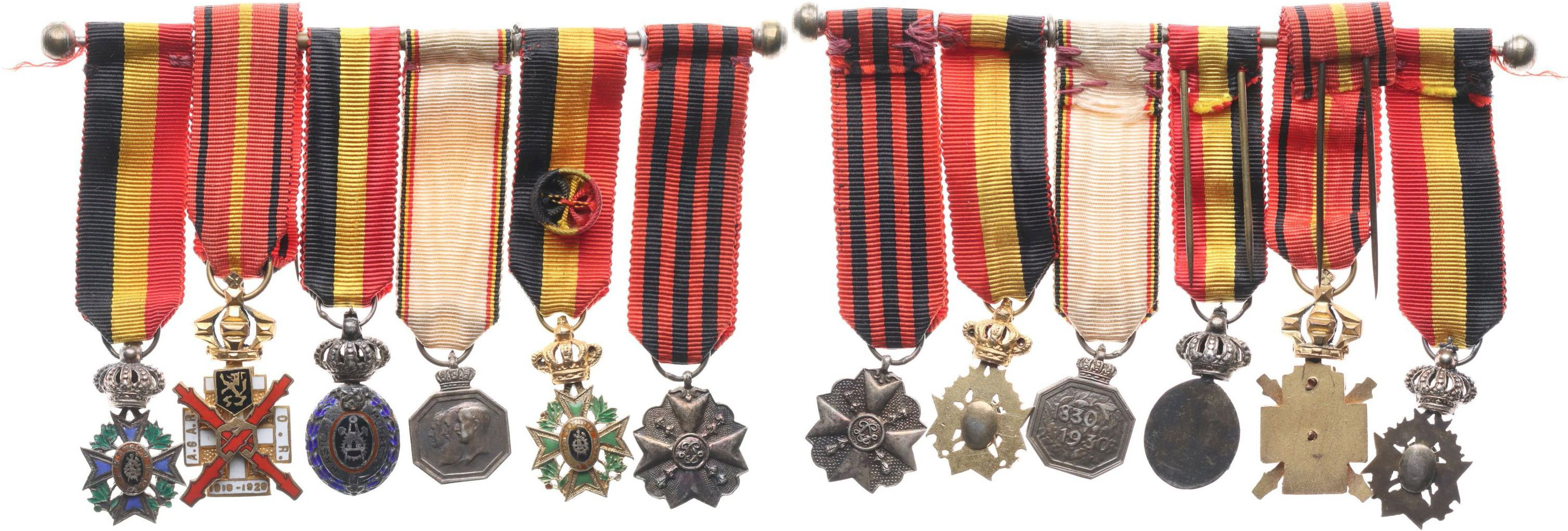 Soubor 6 ks vyznamenání na spojce: 1) vyznamenání práce za průmysl. zásluhy II.tř. 2) pamětní záslužný kříž 1918-29 3) vyznamenání práce II.třídy 4) medaile na 100 let Belgie 5) vyznamenání práce za průmyslové zásluhy I.třídy 6) stříbrná medaile za dlouholetou službu _orig.stuhy celk.6 ks