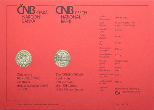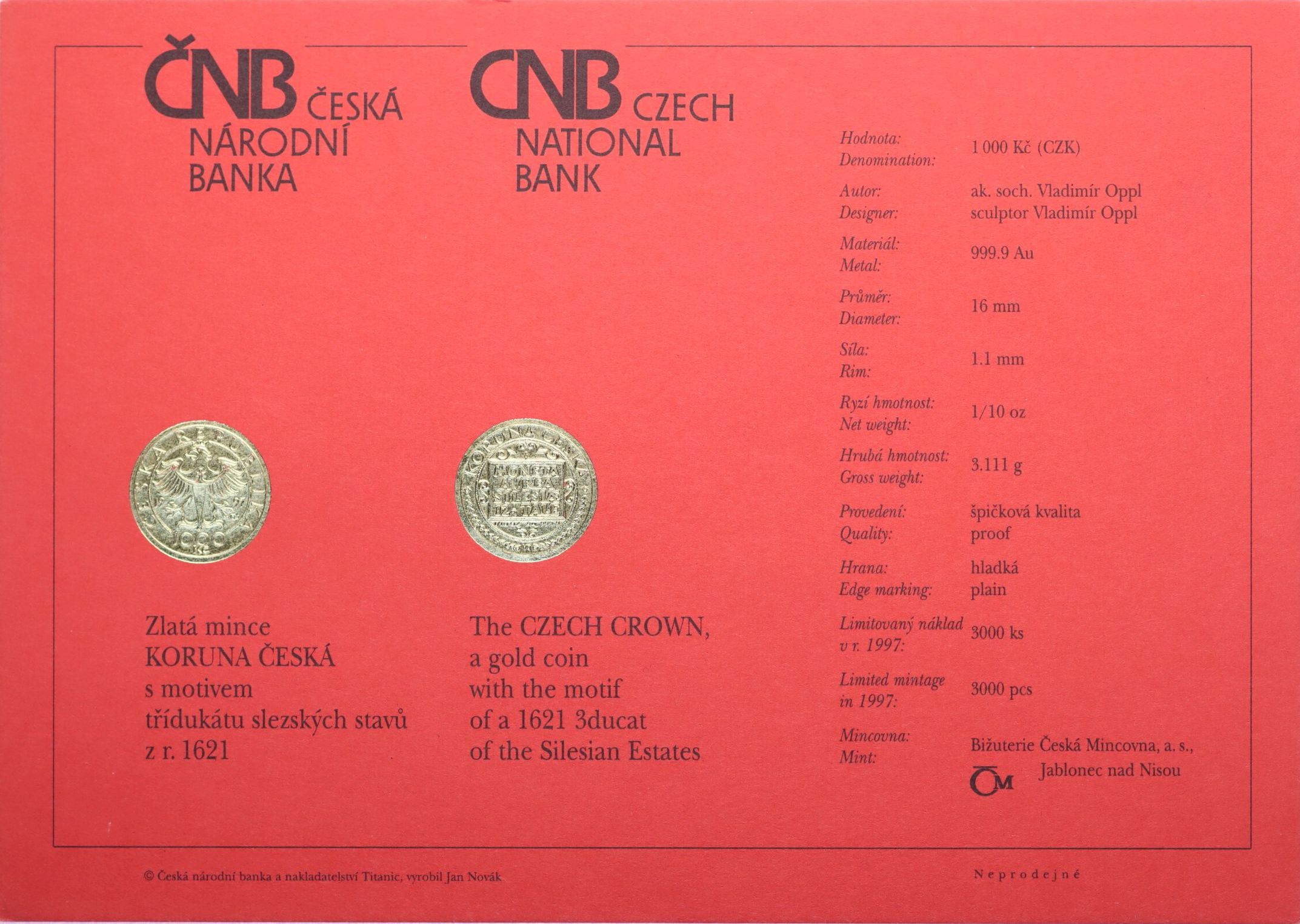 Karta (certifikát) pro minci 1000 Kč 1997 - třídukát Slezských stavů