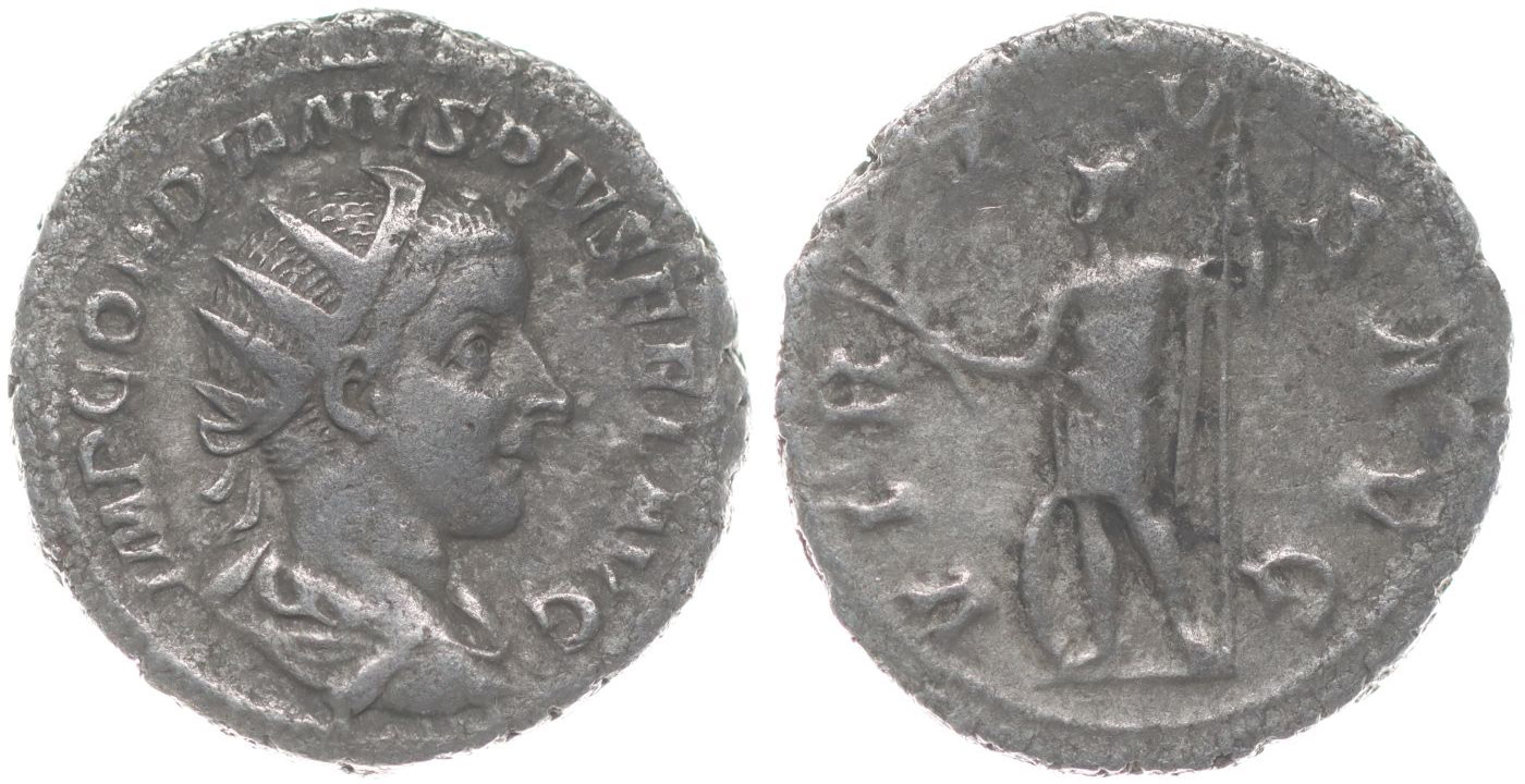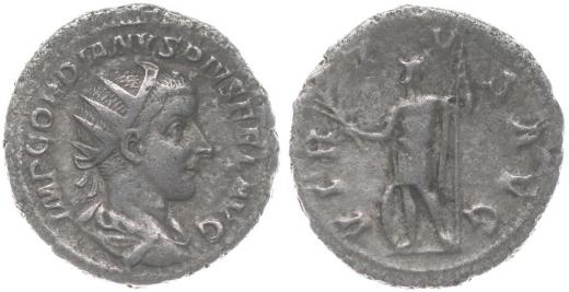 AR Antoninianus, Rv:"VIRTVS.AVG.", stojící Virtus zleva s větvičkou a kopím, K.72.55, S.2365, C.381, RIC.6 - minc. Řím - ražba z let 238-39