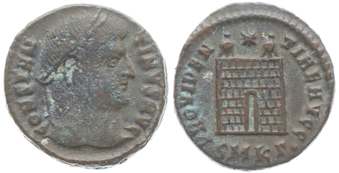 AE3, Rv:"PROVIDENTIAE.AVGG.", táborová brána, minc.Cyzicus S.3778, C.454, K.145.40, RIC.58