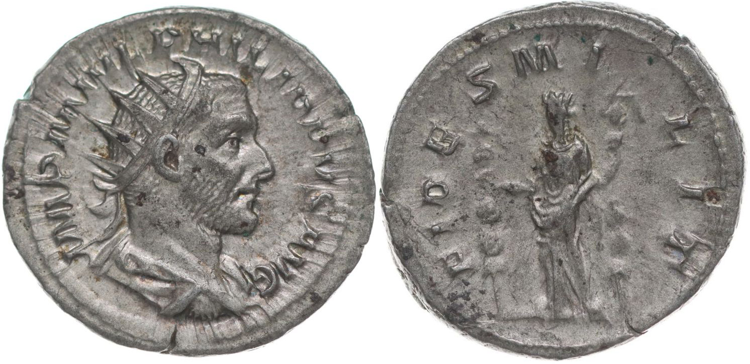 AR Antoninianus, Rv:"FIDES.MILIT.", stojící Fides drží dvě standarty, K.74.9, S.2457, C.54, RIC.32ff - mincovna Řím - ražba z let 244 - 247