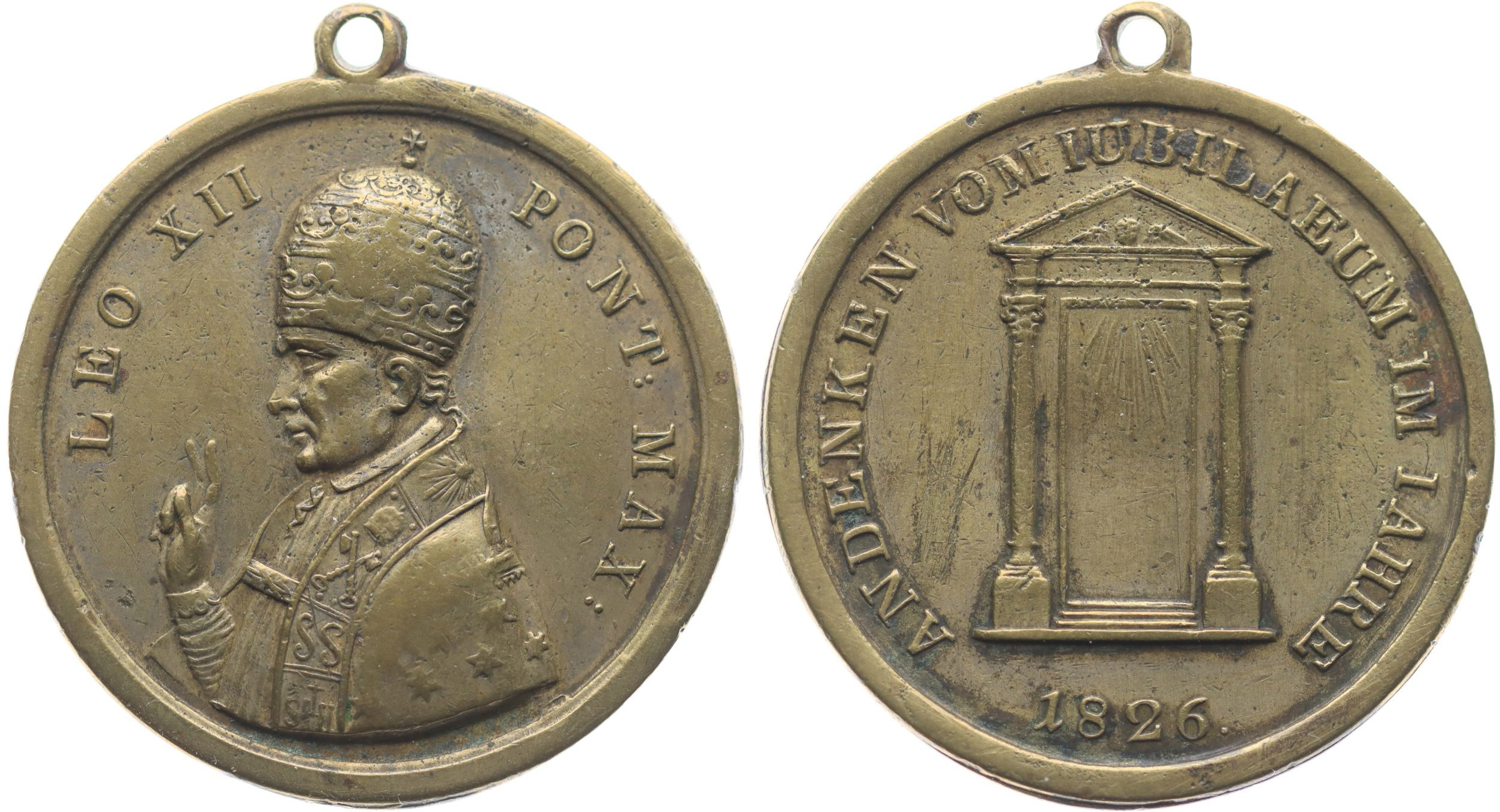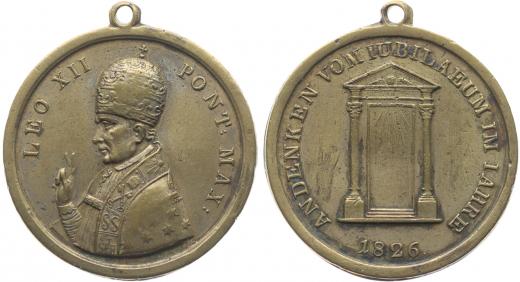 Pamětní medaile na milostivé léto, slavené v arcidiecézi#Mos pražské v r.1826, poprsí papeže Lea XII. zleva, lat.opis / Svatá brána, uvnitř paprsky, něm.opis, Nesign., Mosaz 39 mm, Přib.651 _orig.raž.ouško