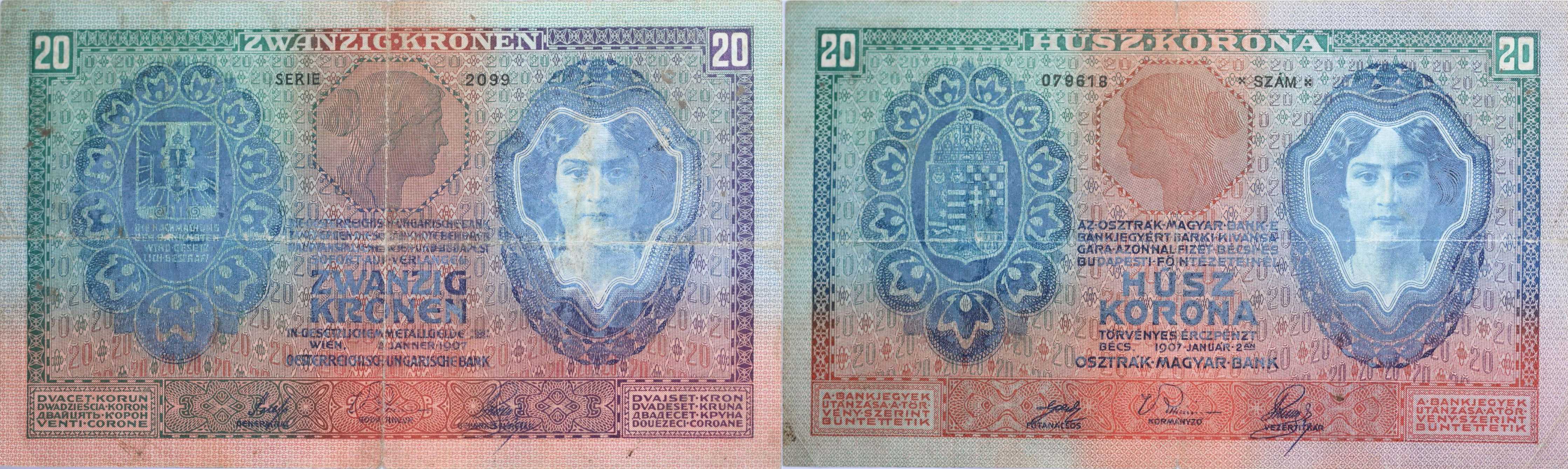 20 Koruna 1907, sér.2099, KM.10, P.166_2x natrž.v přehybu 5, 10 mm