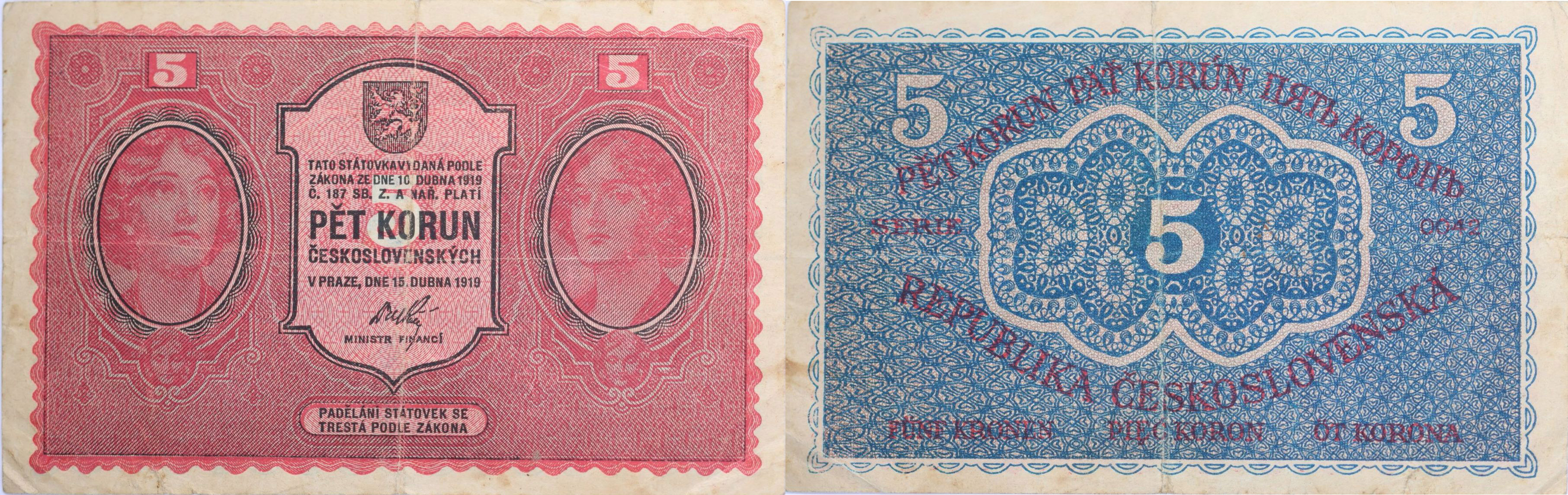 5 Kč 1919, série 0042, B.8, Hejzl.8a_2x natrž. 4 a 11 mm "neperf."