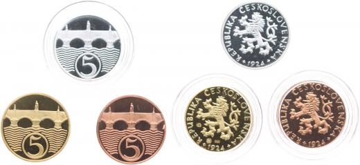 5 Haléř 1924 - Punc.986 Au16 mm 2,65 g, Punc.999 Ag 16 mm, 1,85 g Cu 16 mm, 1,60 g, náklad 35 ks, vydala Zlatá Huta Trenčín _celk 3 ks v orig.dřevěné etui + kapsle + certifikát