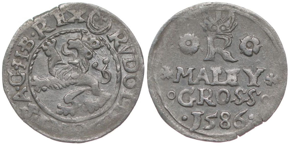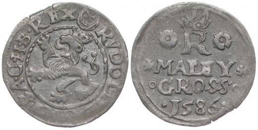 Malý groš 1586, Jáchymov-Hoffmann, HN.8a (opis 7c), Ja.4d1 varianta nápisu: "* MALEY */o GROSS o/·1586 ·"_dr.ned.