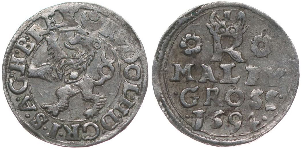 Malý groš 1594, Jáchymov-Hoffmann, HN.8b (opis 7c), J.5 varianta nápisu: "MALEY / ·GROSS· / ·1588 ·"_dr.ned.