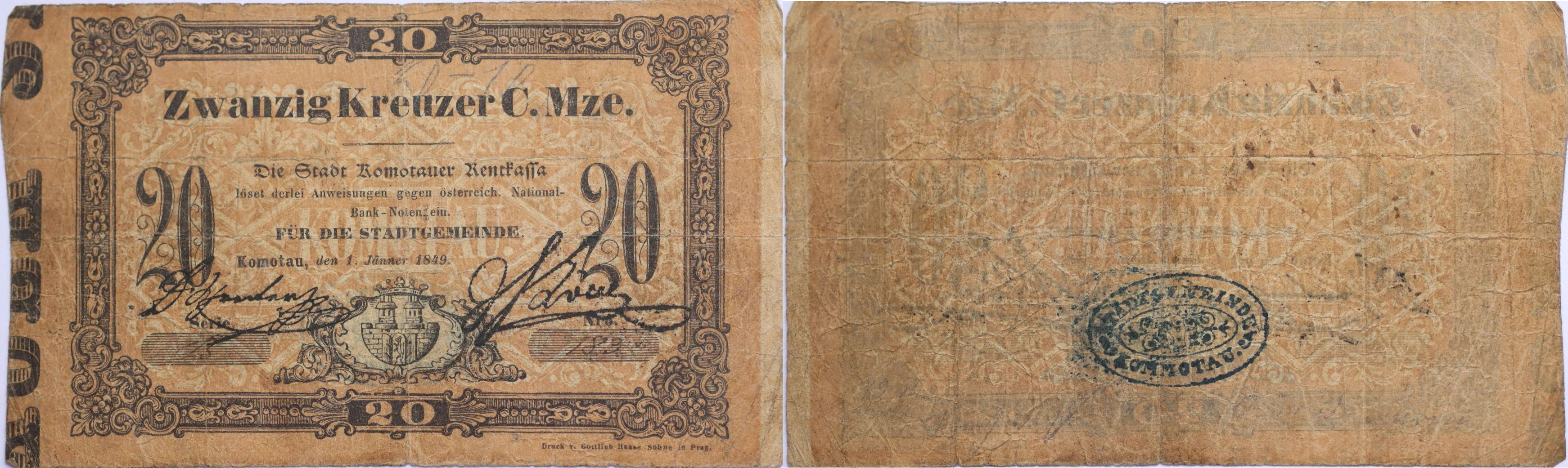 Chomutov (Komottau), 20 Krejcar 1.1.1849, Stadtgemeinde sér.B, čís.:189, VR.220.19.02.b