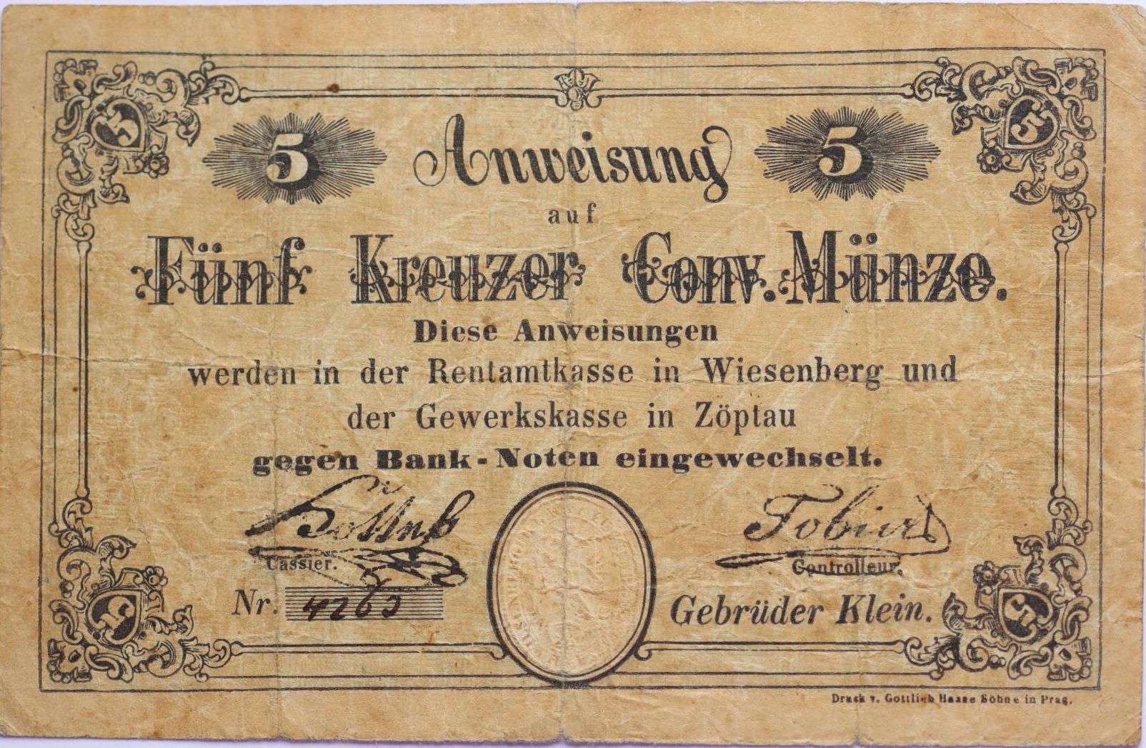 Loučná n.D. (Wiesenberg) a Sobotín (Zöptau) - 5 Kr.C.M. b.l. bratři Kleinové, čís.4260, s podpisy, VR.1480.02.01