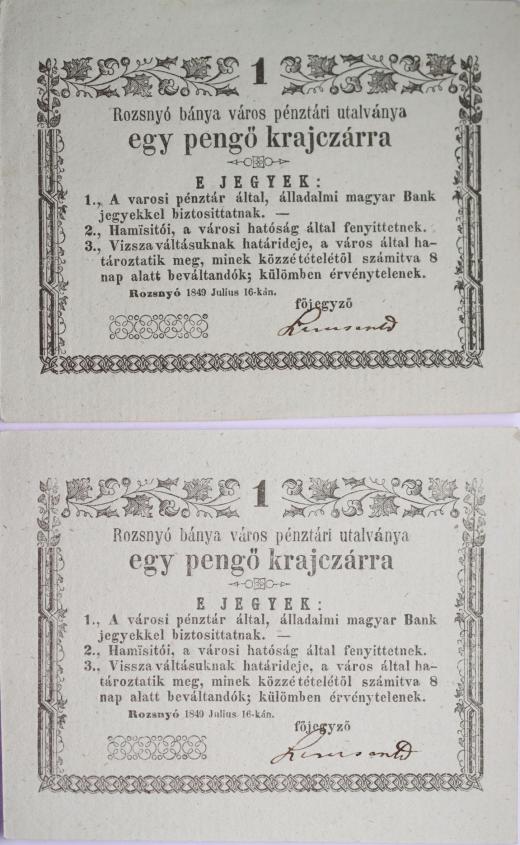 Rožňava (Rozsmyó) - 1 Krejcar 16.7.1849, Vizsza - s vodotiskem bez čísla, Adam.Roz.1.1.2 Rožňava (Rozsmyó) - 1 Krejcar 16.7.1849, Vizsza - bez vodotisku bez čísla, Adam.Roz.1.1.4