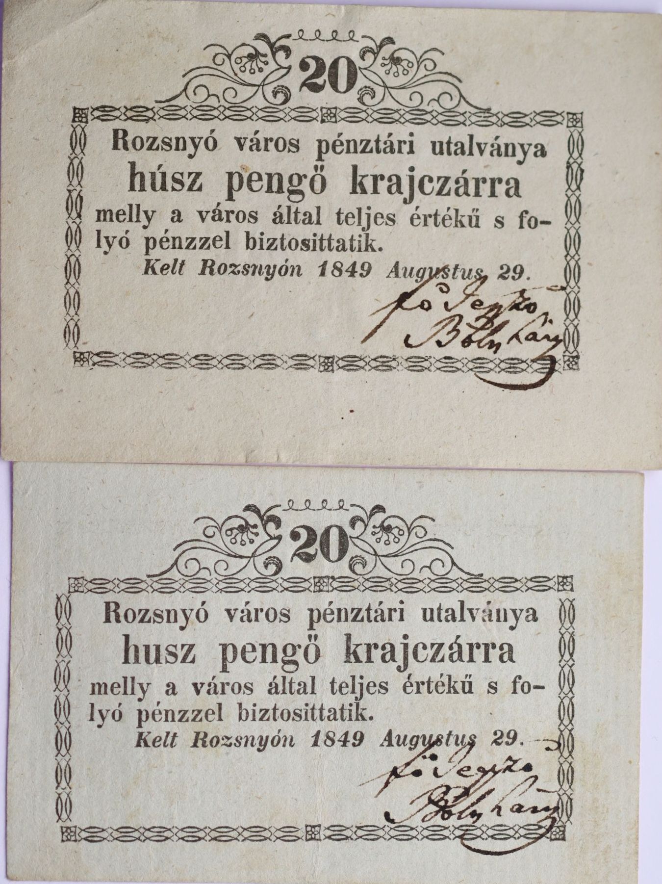 Rožňava (Rozsmyó) - 20 Krejcar 29.8.1849, Adam.Roz.2.1.3 _v rev. pozn. tužkou Rožňava (Rozsmyó) - 20 Krejcar 29.8.1849, husz - bez čárky Adam.Roz.2.1