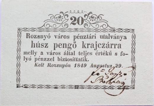 Rožňava (Rozsmyó) - 20 Krejcar 29.8.1849, pravý boční rám posunutý doprostřed, Adam.Roz.2.1.4