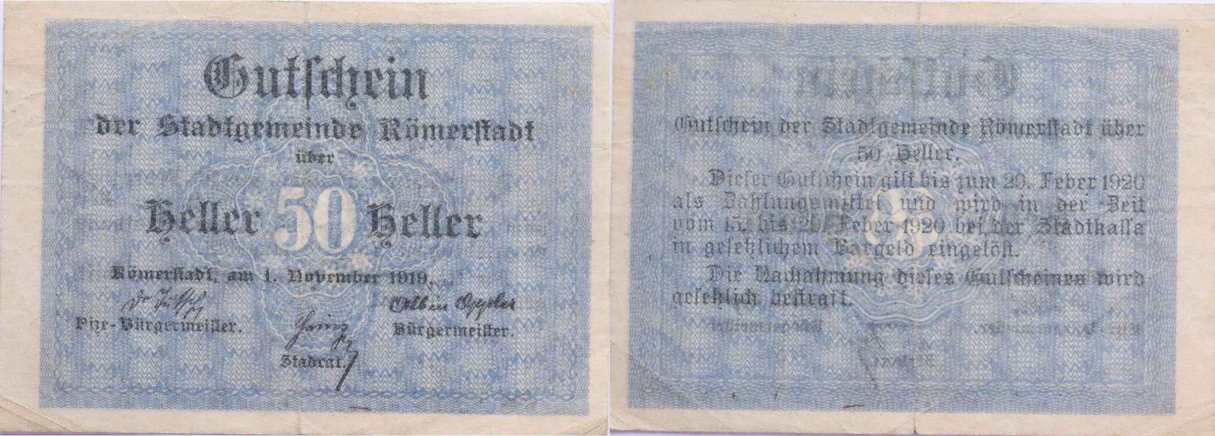 Rýmařov (Römerstadt) - 50 Heller 1.11.1919, DH.175.1.3