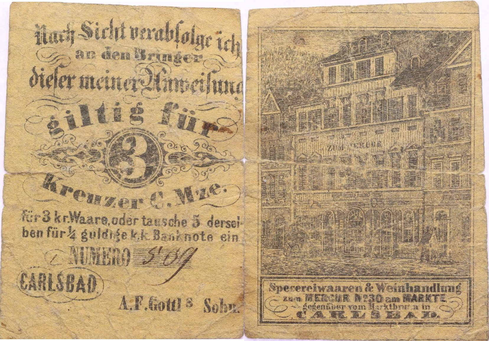 Karlovy Vary (Karlsbad) - 3 Kr. C.M., b.l., A.F.Gottl´s Sohn č.509, V-R.185.16.03.d_2x natrž. v přehybu