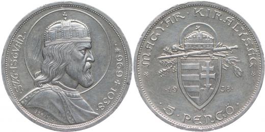 5 Pengö 1938 - sv.Štěpán, KM.516_dr.rysky v av., st. po o. na hr.