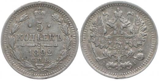 5 Kopějek 1892 SPB, Y.19a.1, Uzd.2012 skup.XIX-E/d