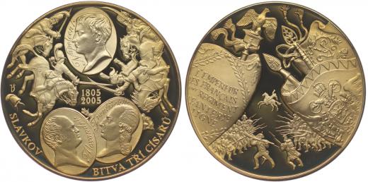 Slavkov - 200.výroří bitvy tří císařů 1805 - 2005 Medailony s portréty císařů, opis / válečná vřava se symboly Sign., Mosaz 50 mm, 56 g, KZ.176_orig.etue + kapsle + certifikát