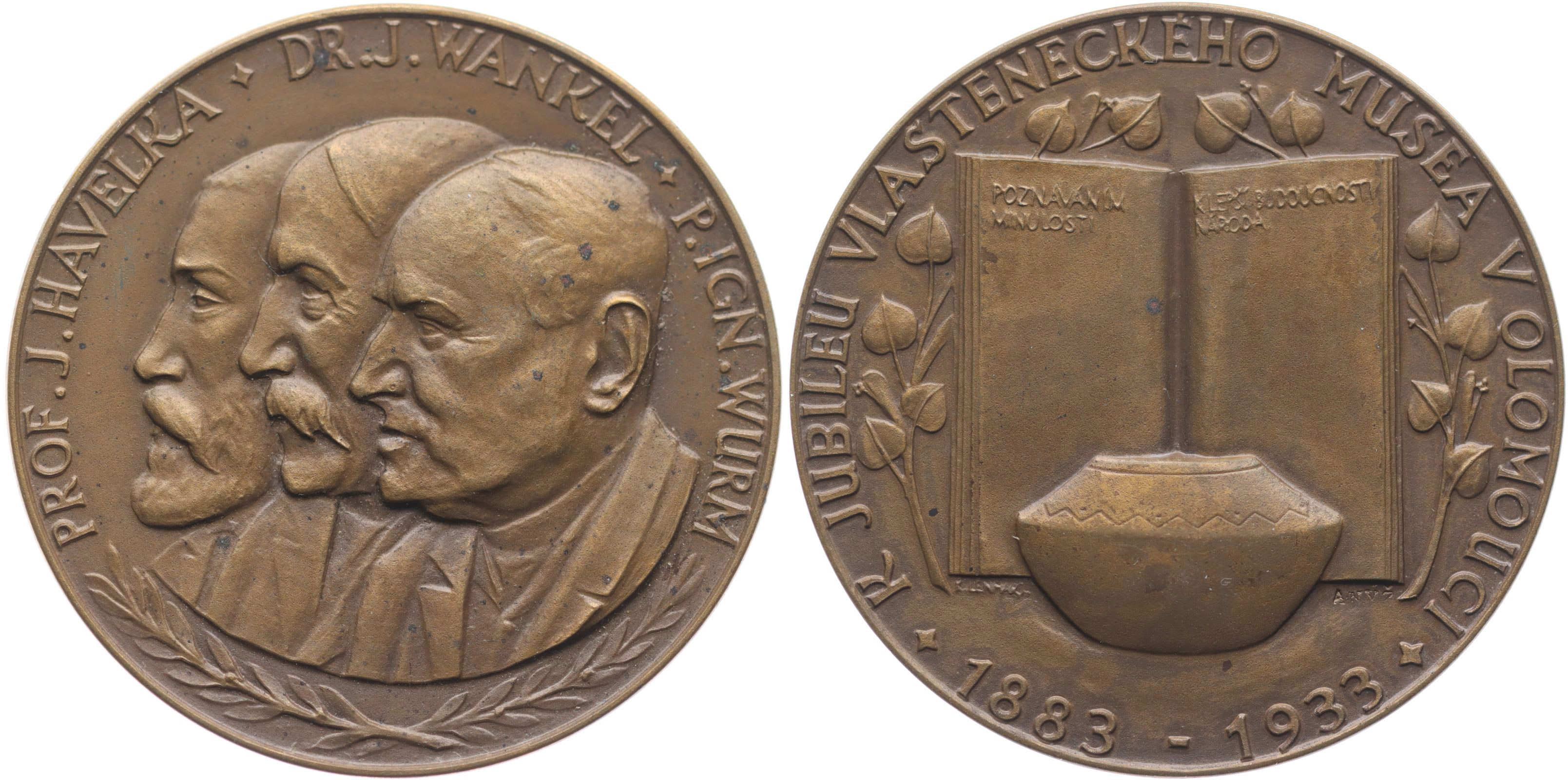 Lenhart - k jubileu vlasteneckého musea, 1883 - 1933#Br Poprsí tří zakladatelů zleva, opis / rozevřená kniha, pravěká nádoba, lip.snítky, opis, Sign.Lenhart - Anýž Bronz 50 mm, jako Taul.522