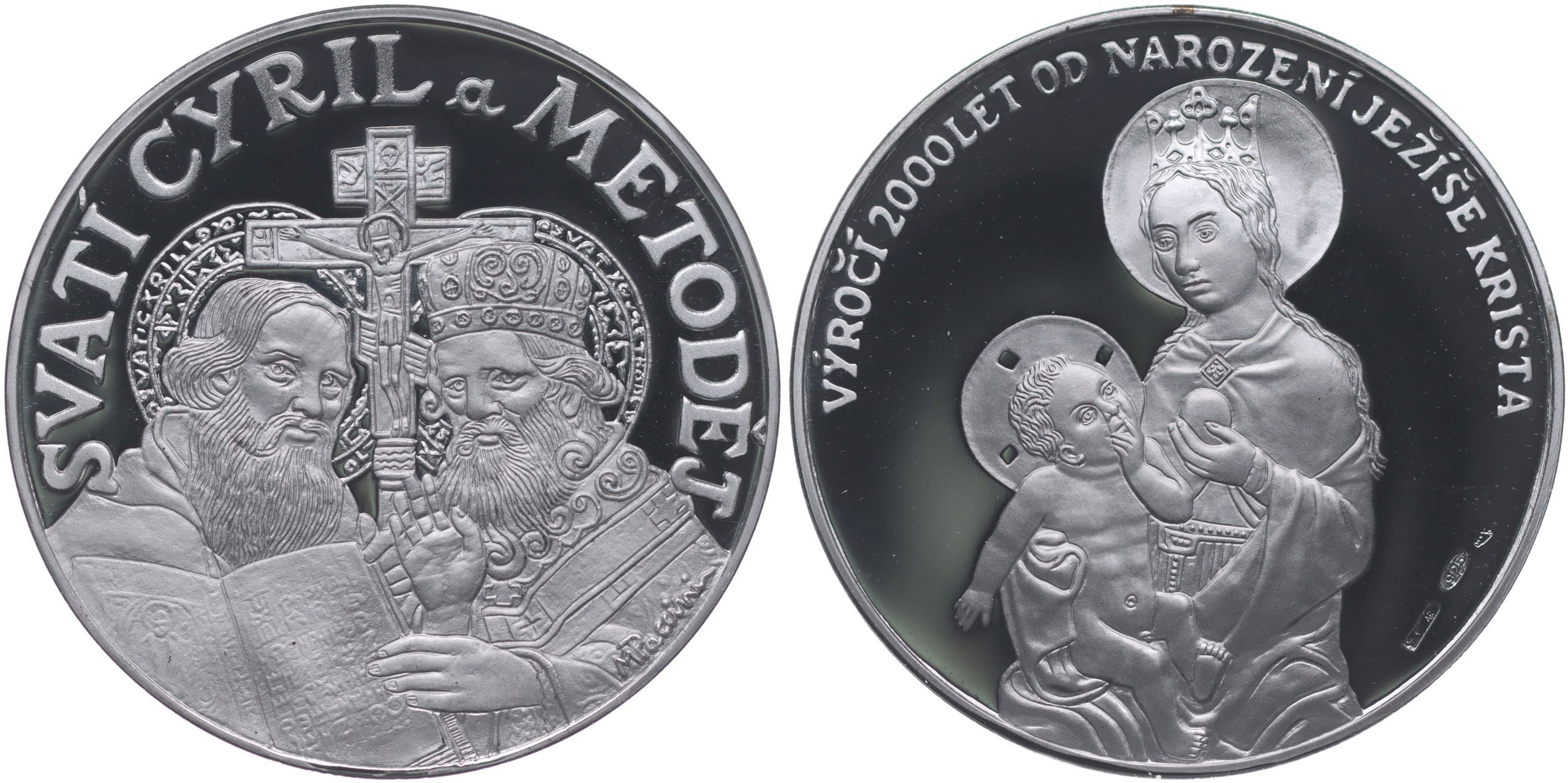 M.Paccini - medaile k výročí 2000 let od narození Ježíše Krista, b.l. Poprsí Svatých Cyrila a Metoděje, opis / Madona s dítětem, opis Punc.925, Ag 40 mm, 20 g_orig.kasple