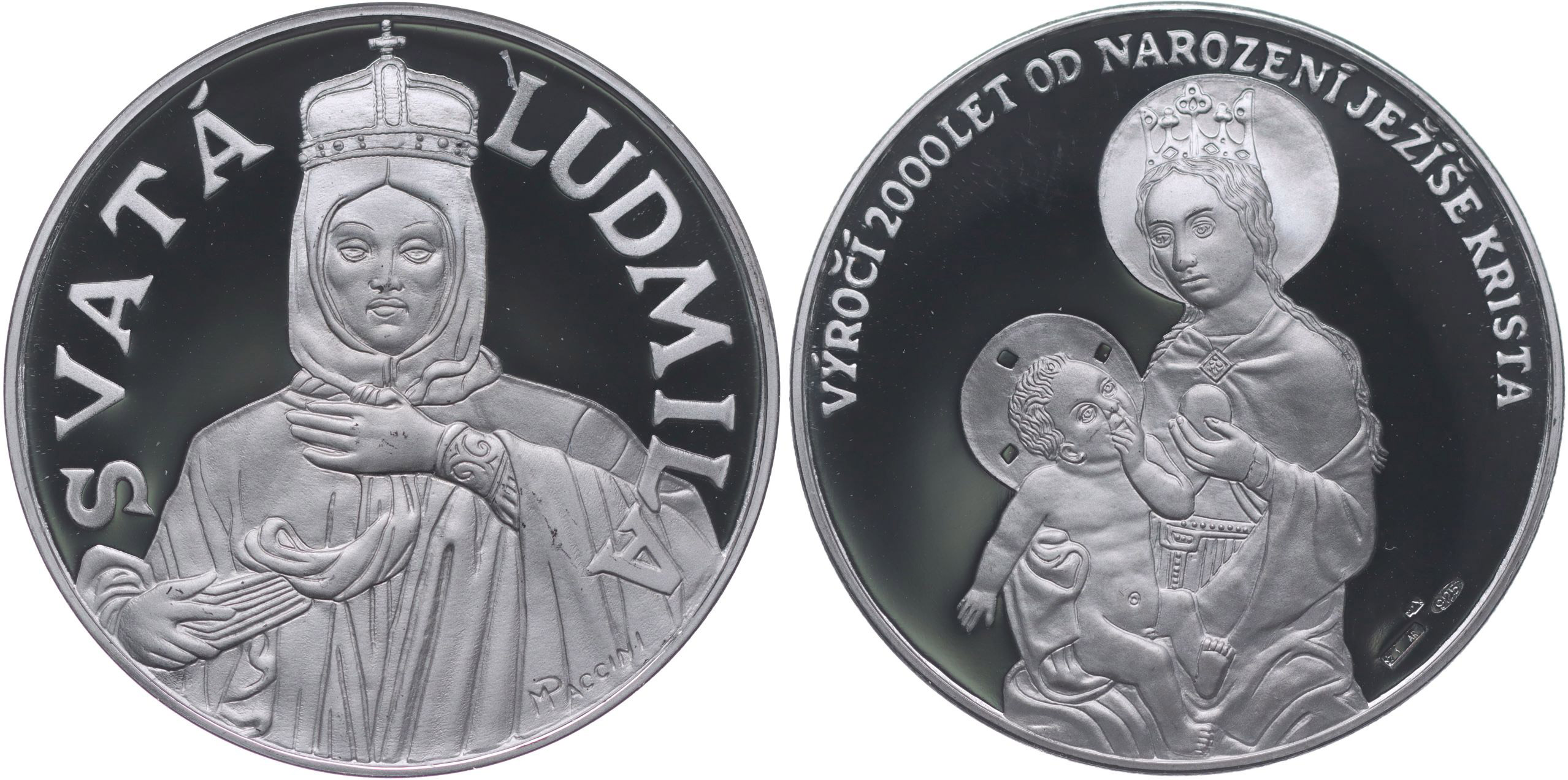 M.Paccini - medaile k výročí 2000 let od narození Ježíše Krista, b.l. Poprsí Svaté Ludmily čelně, opis / Madona s dítětem, opis Punc.925, Ag 40 mm, 20 g_orig.kasple