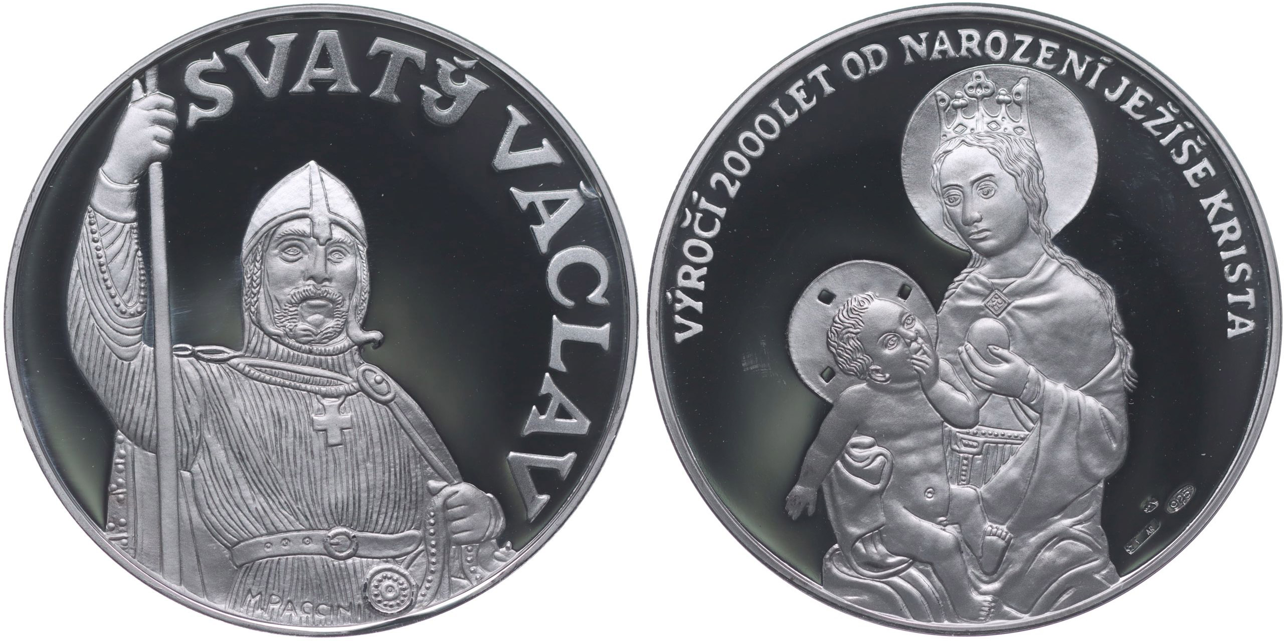 M.Paccini - medaile k výročí 2000 let od narození Ježíše Krista, b.l. Poprsí Svatého Václava čelně, opis / Madona s dítětem, opis Punc.925, Ag 40 mm, 20 g_orig.kasple