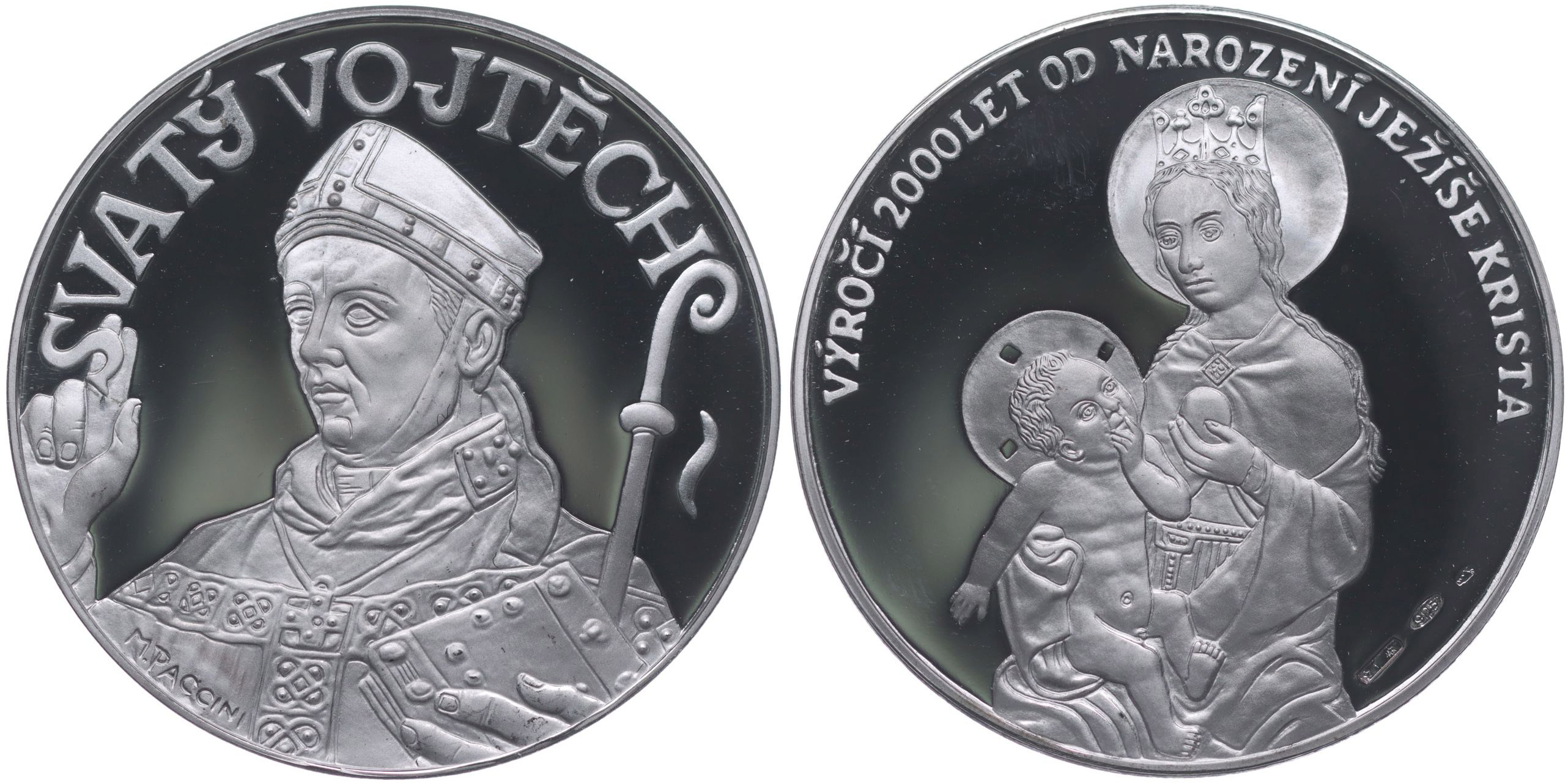 M.Paccini - medaile k výročí 2000 let od narození Ježíše Krista, b.l. Poprsí Svatého Vojtěcha mírně zleva, opis / Madona s dítětem, opis Punc.925, Ag 40 mm, 20 g_orig.kasple