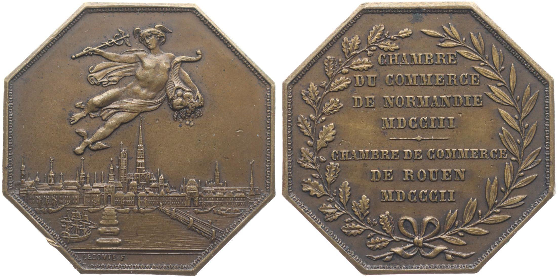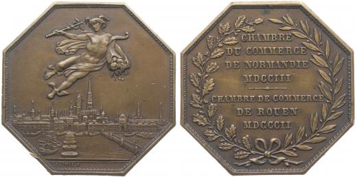 Lecomte F. - medaile obchodní komory v Normandii MDCCIII (1703) a obchodní komory města Rouen MDCCCII (1802), letící bohyně obchodu nad městem / 7řádk.nápis ve věnci, Bronz.osmihran 34x34 mm, 18,58 g