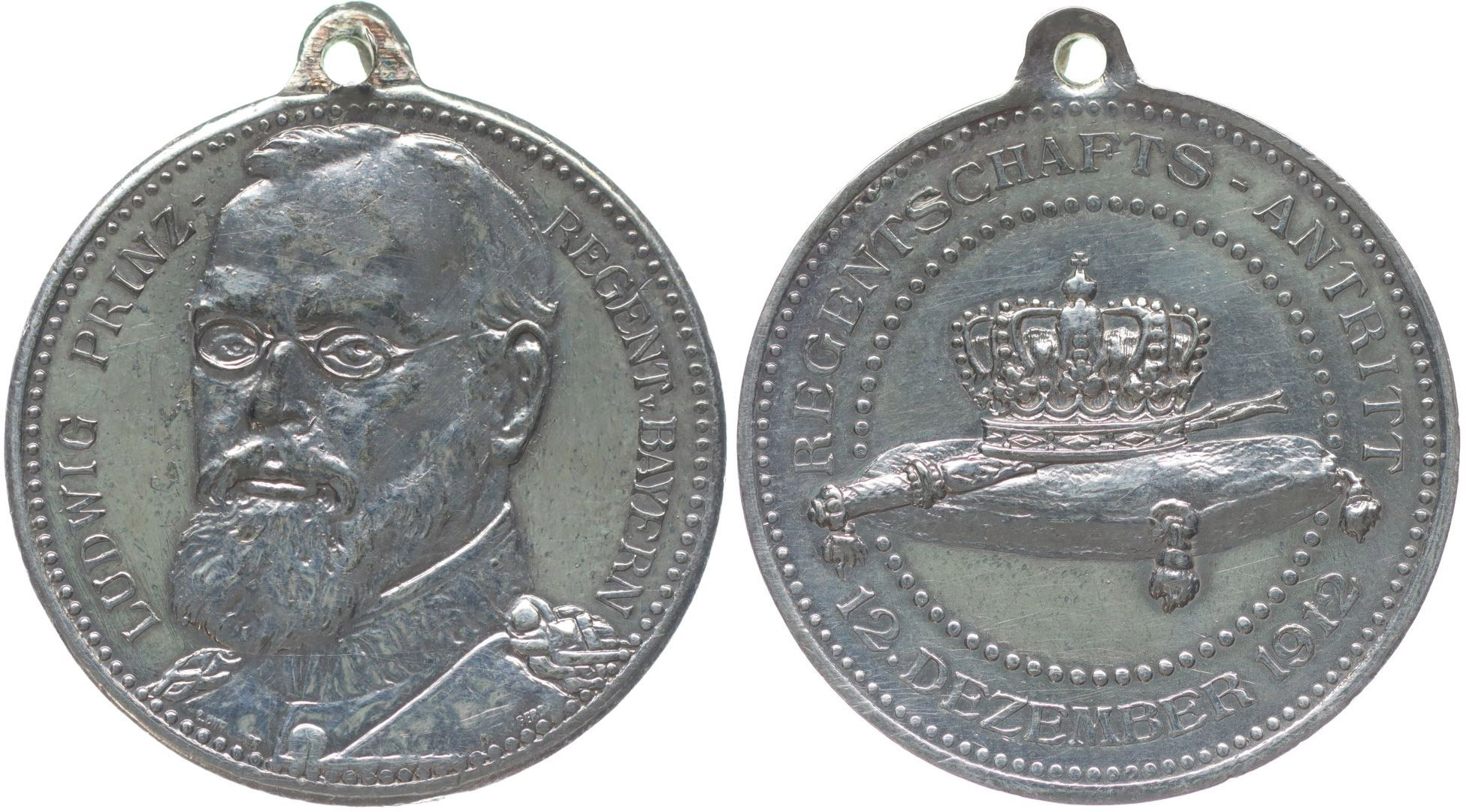 Ludwig prinzregent - na nástup na trůn 12.12.1912 Hlava čelně mírně zleva, opis / koruna na podušce, opis Nesign., Bílý kov 30,5 mm, 15,23 g_orig.raž.ouško