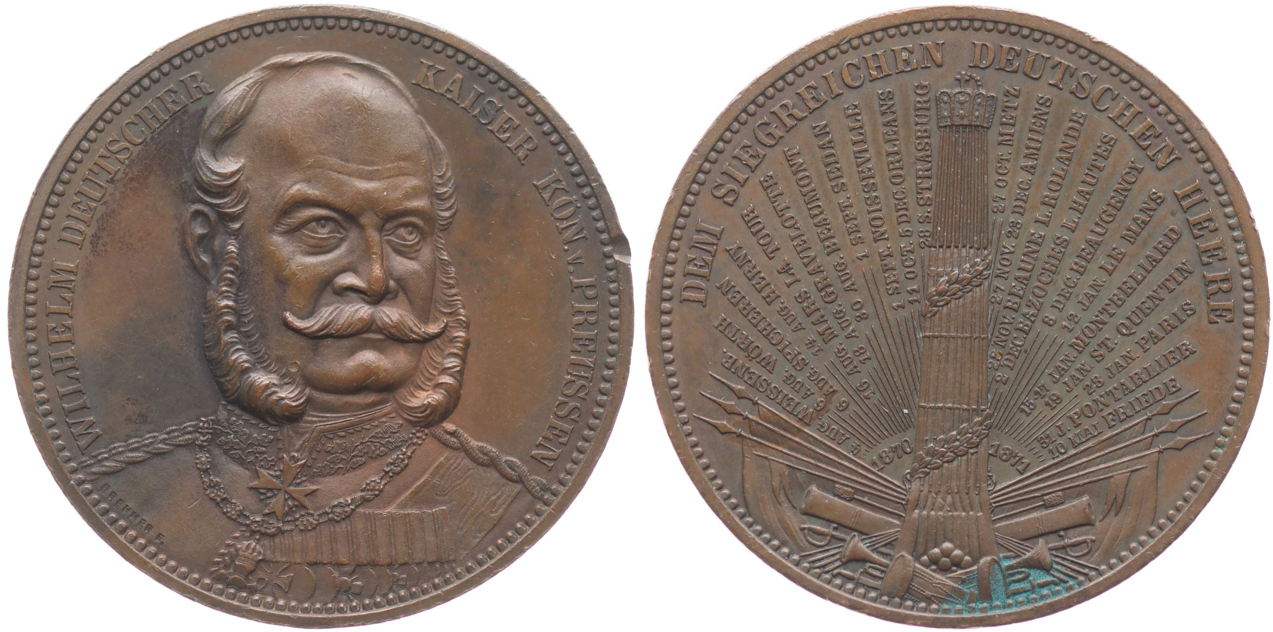 Vilém I. - na vítězství Německa nad Francií 1870 -1871 Poprsí čelně, opis / u sloupu vojenské atributy, v ploše data vítězných bitev, opis, Sign.Brehmer F., Bronz 40 mm_dr.hr.v av.