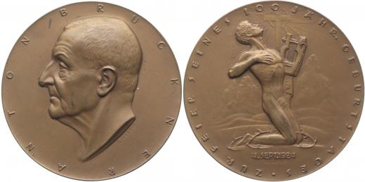A.Hartig - Anton Bruckner - medaile k 100.výr.narození 1824 - 1924 Portrét zleva, opis / klečící mužská postava, opis, Sign., Bronz 60 mm