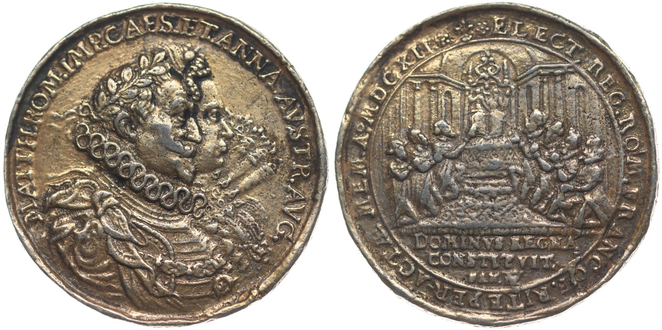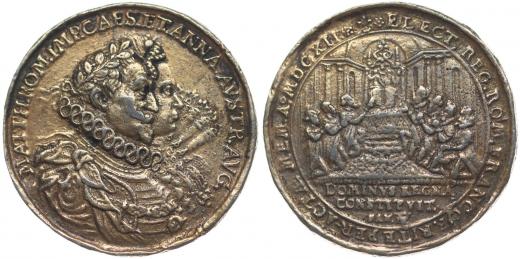 medaile na volbu na římského císaře ve Frankfurtu 13.6.1612 Dvojportrét Matyáše a Anny zprava, opis / císařský pár na trůně a sedm kurfiřtů, opis, Pozlac.Ag 40 mm, 20,72 g, Nov.IV/C-8b,, JF.305_R!