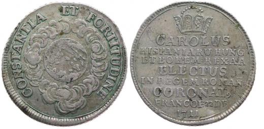 Větší peníz na korunovaci na římského císaře ve Frankfurtu 22.12.1711 Pod korunou 8řádk.nápis / zeměkoule v oblacích, opis, Nesign., Ag 26 mm, 4.44 g, Nov.XI/F-42b, JF.680c_R!