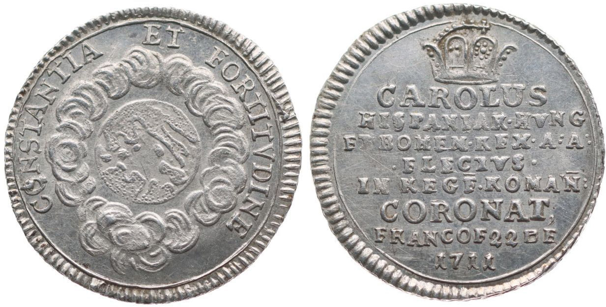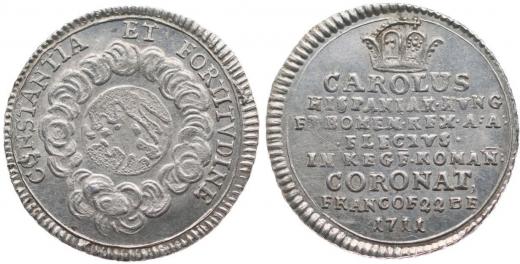 Menší peníz na korunovaci na římského císaře ve Frankfurtu 22.12.1711 Pod korunou 8řádk.nápis / zeměkoule v oblacích, opis, Nesign., Ag 19 mm, 2.11 g, Nov.XI/F-47b, Mo.1368_R!