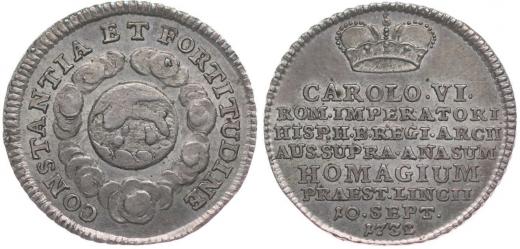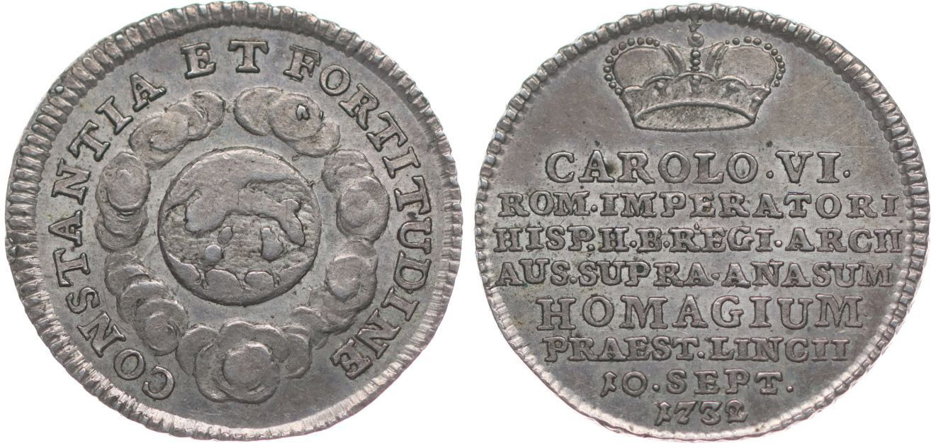 Menší peníz na holdování hornorakouských stavů, 10.9.1732 Koruna, 7řádk.nápis / zeměkoule v oblacích, opis, Nesign., Ag 20 mm, 1.92 g, Mo.1608, LG.XV č.904, Nov.XI/BB--3b_R!