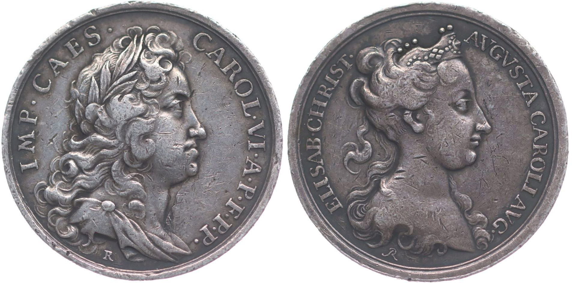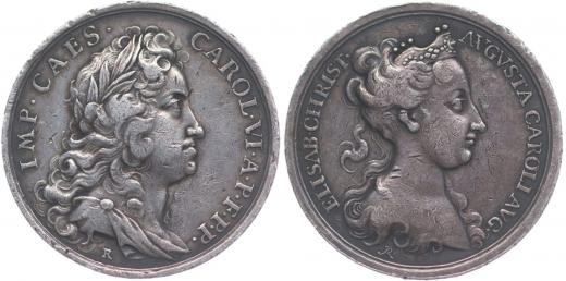 B.Richter - medaile na korunovaci na uherskou královnu,18.10.1714 Portrét císaře zprava, opis / portrét císařovny zprava, opis Sign.R., Ag 30 mm, 14,85 g, Nov.XI/GG-49a, LG.XV/550, Mo.1415_R!