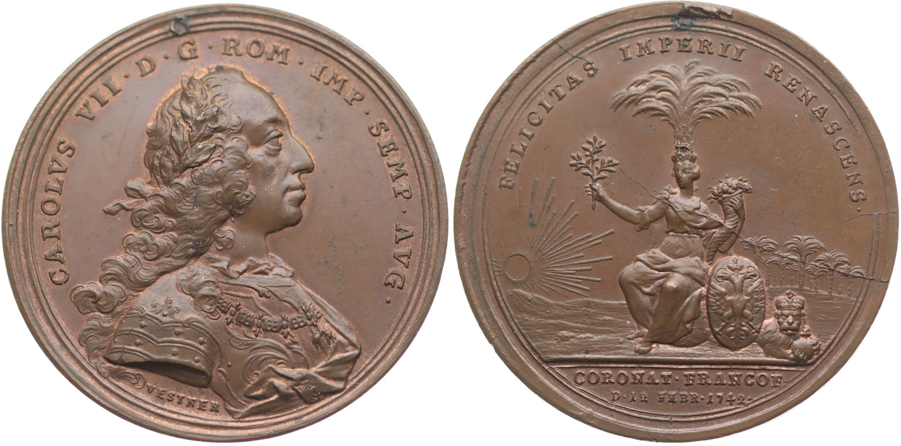 Vestner - medaile na korunovaci na římského císaře 12.2.1742 ve Frankfurtu n.M. portrét zprava, opis / korunovaná ženská postava s palmou v pozadí, Sign., Bronz 44 mm, 31,3 g, Nov.XII/C-3b, JF.751 _dr.ďub. v av. a rev. R!