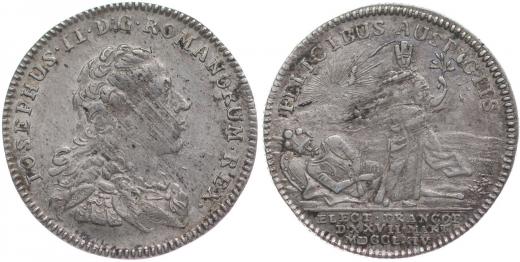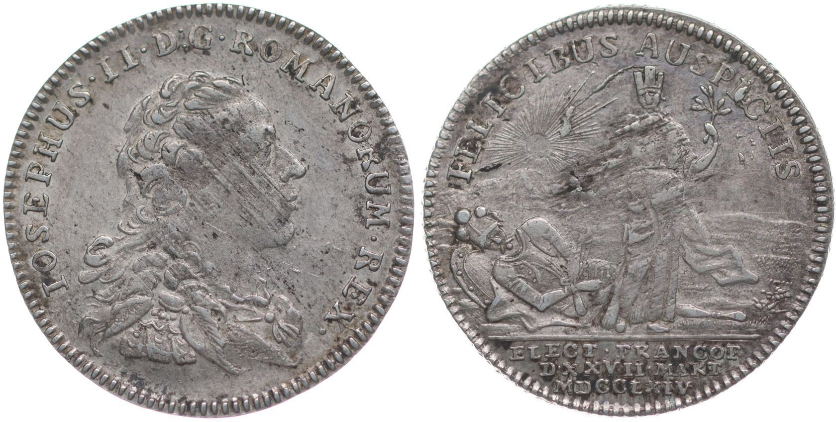 Větší peníz na volbu ve Frankfurtu, 27.3.1764 Portrét císaře zprava, opis / patronka města nad spoutaným válečníkem, opis, nápis v úseči, Ag 26 mm, 3,90 g, JF.841b, Nov.XV/B-3b _dr.just. v av. a rev.