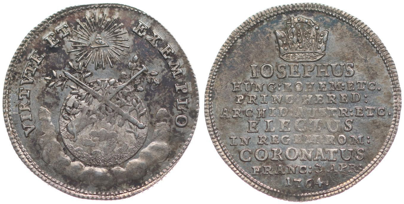 Menší peníz na korunovaci ve Frankfurtu, 3.IV.1764 Pluh a meč na zeměkouli, boží oko, opis / cís.koruna a 9řádkový nápis, Ag 21 mm, 1.96 g, Mo.1922, Ho.3128, Nov.XV/C-14b