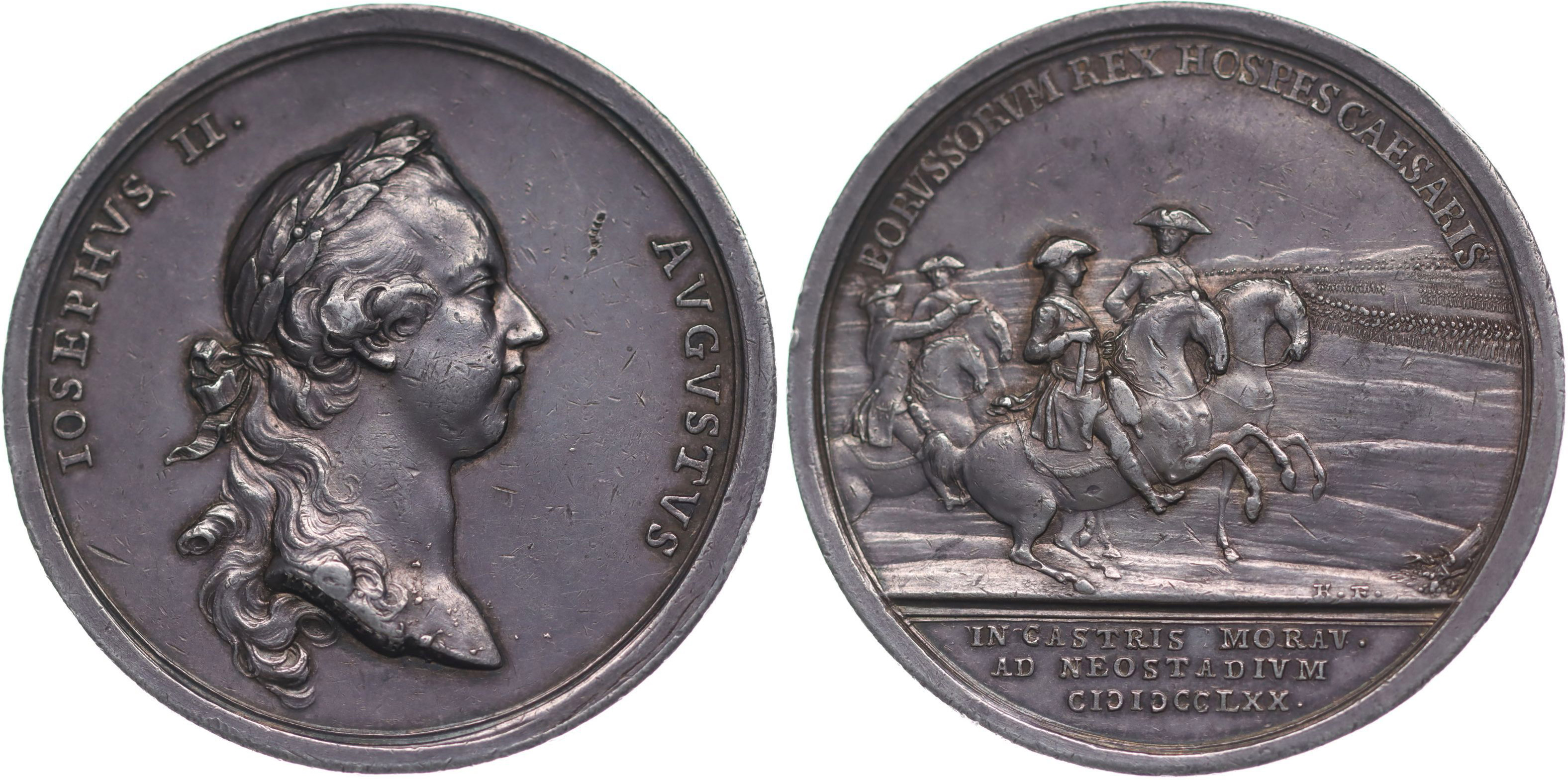Krafft - medaile na návštěvu krále Friedricha II. v Uničově 1770 Hlava Josefa II. zprava, opis / Josef II. a Friedrich II. na koni před armádou, opis, 3 řádk.nápis v úseči, Sign., Ag 49 mm, 43,59 g Mont.2026, SD.235, LG.XIV/263_R!