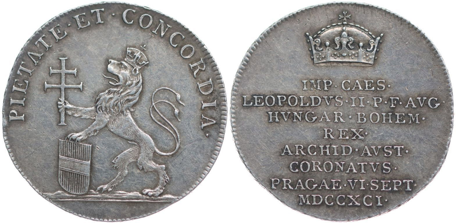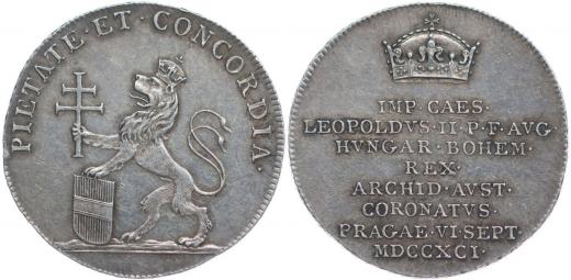 Větší peníz na korunovaci v Praze, 6.IX.1791 Koruna, nápis / stojící lev, znak a Svatoondřejský kříž, opis, Ag 25 mm, 4.34 g, Nov.XVI/Q-3b, Mo.2240, ČS.1431, Don.3052