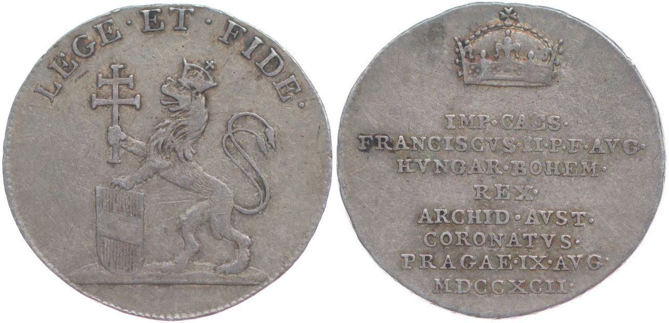 Menší peníz na korunovaci v Praze, 9.8.1792 Koruna, nápis / lev s dvojitým křížem a znakem, opis, Ag 20 mm, 2.16 g, ČS.1438, Mo.2279, Nov.XVII/H-4b