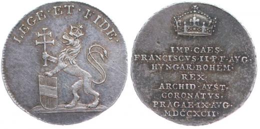 Menší peníz na korunovaci v Praze, 9.8.1792 Koruna, nápis / lev s dvojitým křížem a znakem, opis, Ag 20 mm, 2.18 g, ČS.1438, Mo.2279, Nov.XVII/H-4b