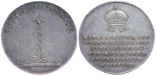 Menší peníz na korunovaci v Bratislavě, 7.IX.1808 Koruna, 6-řádkový nápis / lilie, opis, Nesign., Nepunc., Ag 20 mm, 2,21 g, M.2361, H.3402, Nov.XVII/U-3b