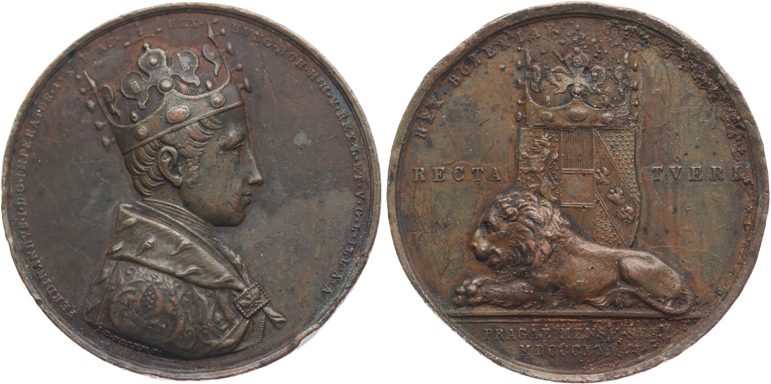 Boehm - medaile na korunovaci v Praze, 7.9.1836#Br Poprsí zprava, opis / ležící lev, korunovaný český znak, 2řádk.nápis v úseči, opis, Cu 47 mm, 80,42 g, Nov.XVIII/D-1c, ČS.1493, P.III/3 _čet.hry v av. a rev., dr.st.kor. v rev.