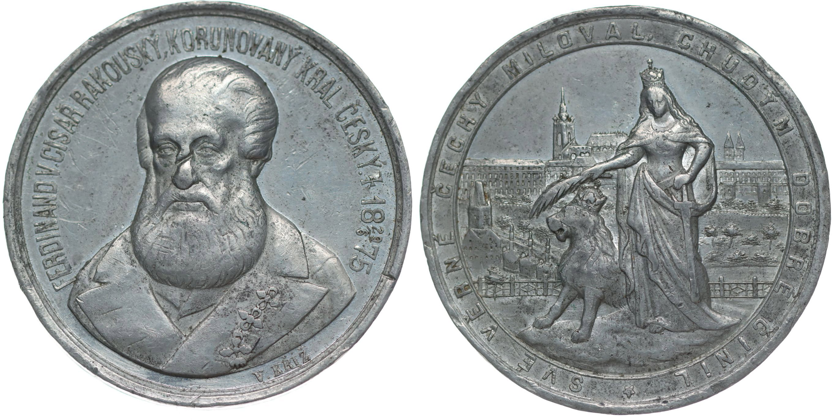 V.Kříž - úmrtní medaile 29.6.1875 Poprsí mírně zleva, opis / stojící Čechie se lvem, Pražský Hrad, opis, Sn 42 mm, 34 g, ČS.1508