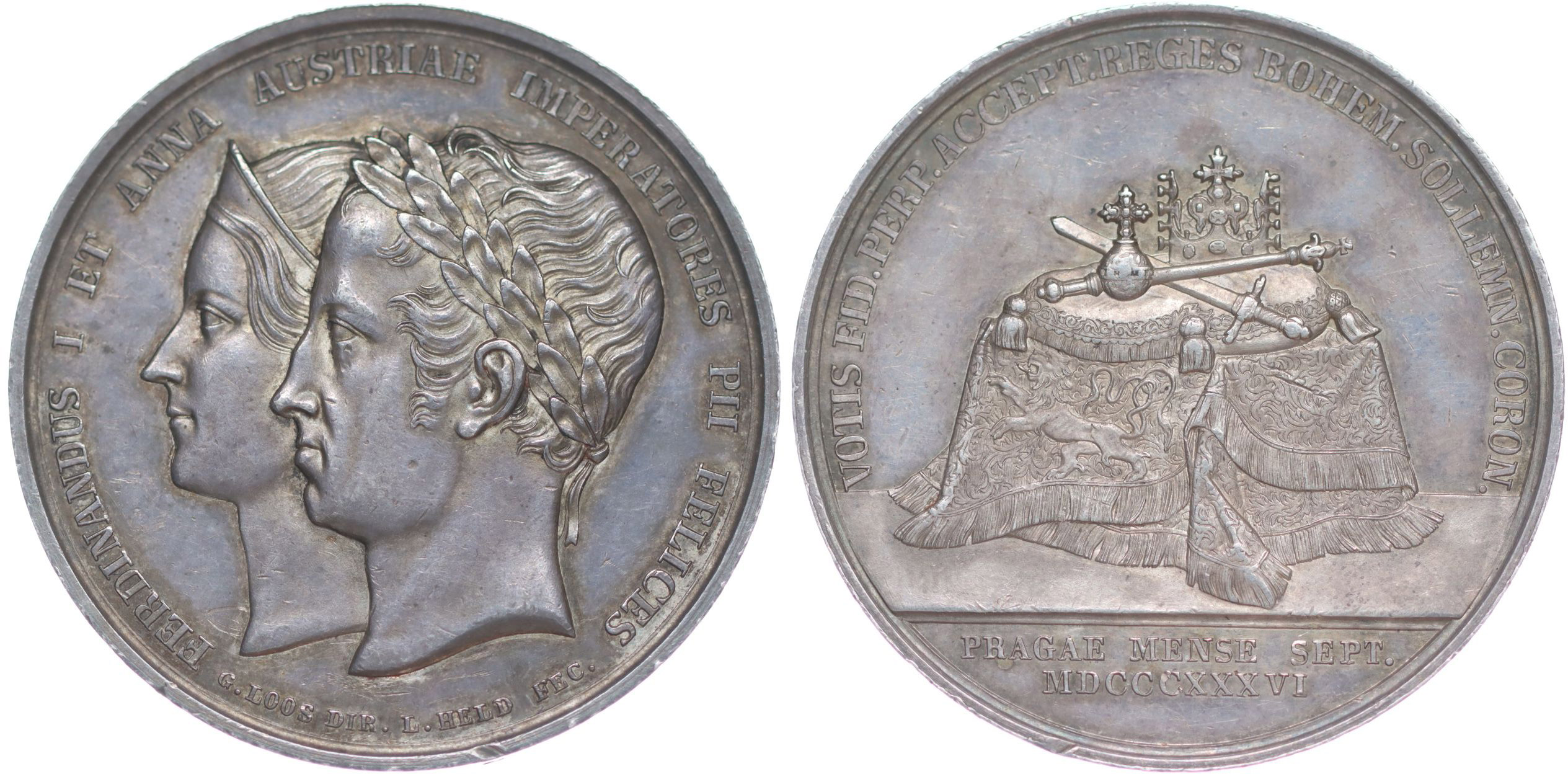 Loos a Held - medaile na korunovaci v Praze, 1836#Ag Dvojportrét zleva, opis / korunovační klenoty na stole, opis, Sign., Ag 39 mm, 19,34 g, ČS.1498, P.III/17, Nov.XVIII/1-Ib, Mo.2559