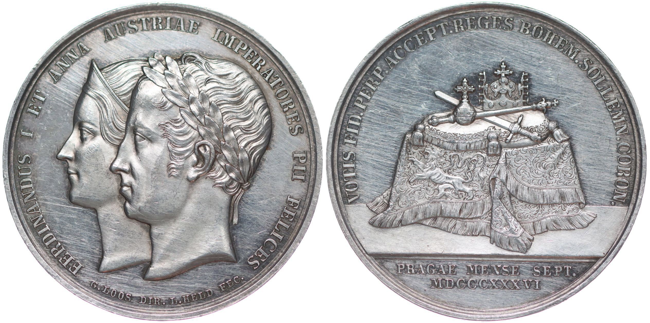 Loos a Held - medaile na korunovaci v Praze, 1836#Ag Dvojportrét zleva, opis / korunovační klenoty na stole, opis, Sign., Ag 39 mm, 19,55 g, ČS.1498, P.III/17, Nov.XVIII/1-Ib, Mo.2559