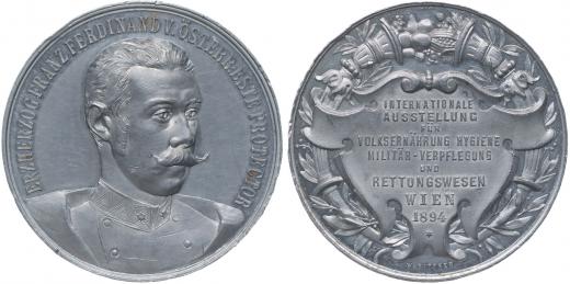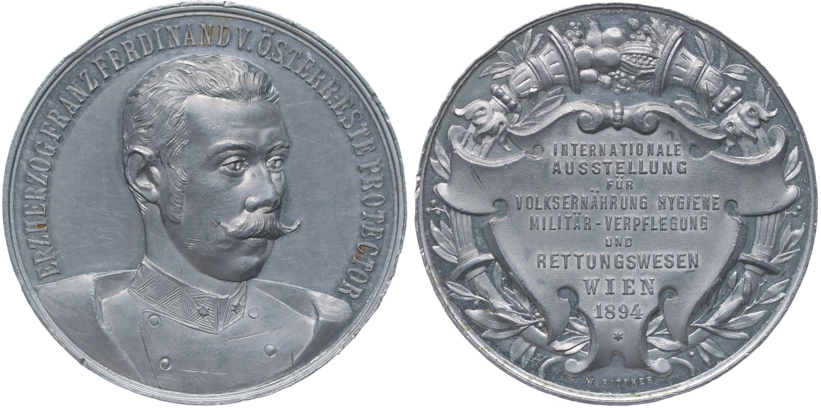 W.Pittner - mezinárodní výstava hygienického stravování ve Vídni 1894 Poprsí čelně mírně zprava, opis / 9řádk.nápis v ozdobné kartuši, po obvodu zdobený věnec,Sign., Al 40 mm, Haus.3023, Wu.2435