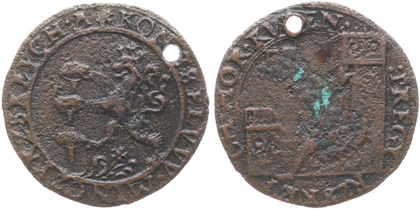 Početní groš měděný b.l., český lev drží tři razidla, opis / sedící pregéř s kladivem v ruce, opis, Cu 21 mm, 2,24 g, Pol.0, Smíš.154 _st.kor., dírka RRR!